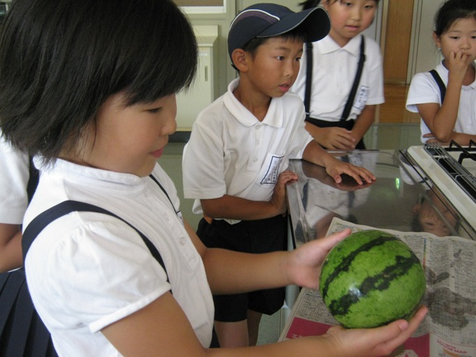包丁で切ってみると,中は,真っ赤に熟し,子どもたちは大喜び。みんなで分け合って食べました。