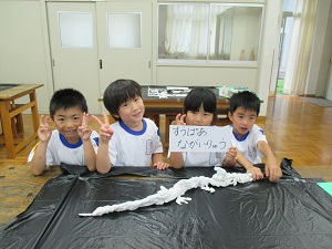できた作品について、グループごとに発表しました。友だちからほめてもらえると、また作りたくなるものですね。最後に壊してしまうのが、とてももったいなかった子どもたちでした。