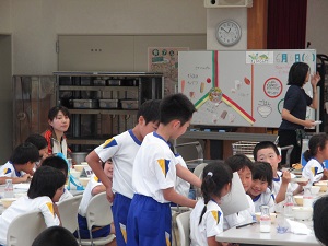 そのような給食の時間ですが、時には委員会の活動の場にもなります。今週は、すこやか委員会が1年生インタビューを行っています。答える1年生は、はっきりと大きな声で答えることができました。インタビューをする上級生も、1年生が答えやすいようにゆっくりと質問したり、答えに対して相槌をうったりすることができていました。